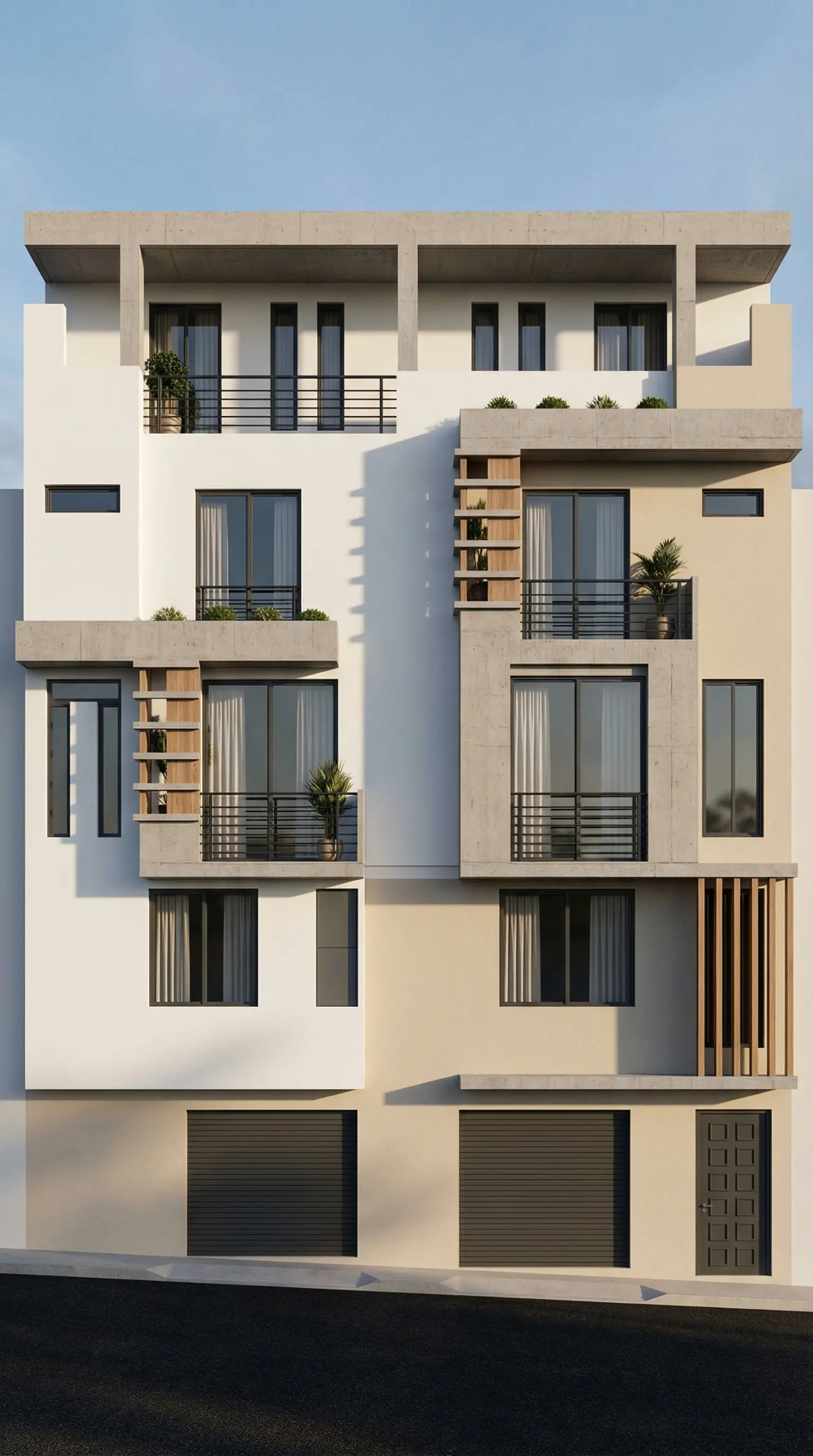 Donnez vie à vos élévations. Transformez un simple plan de façade en une perspective 3D texturée et éclairée, respectant votre vision architecturale.